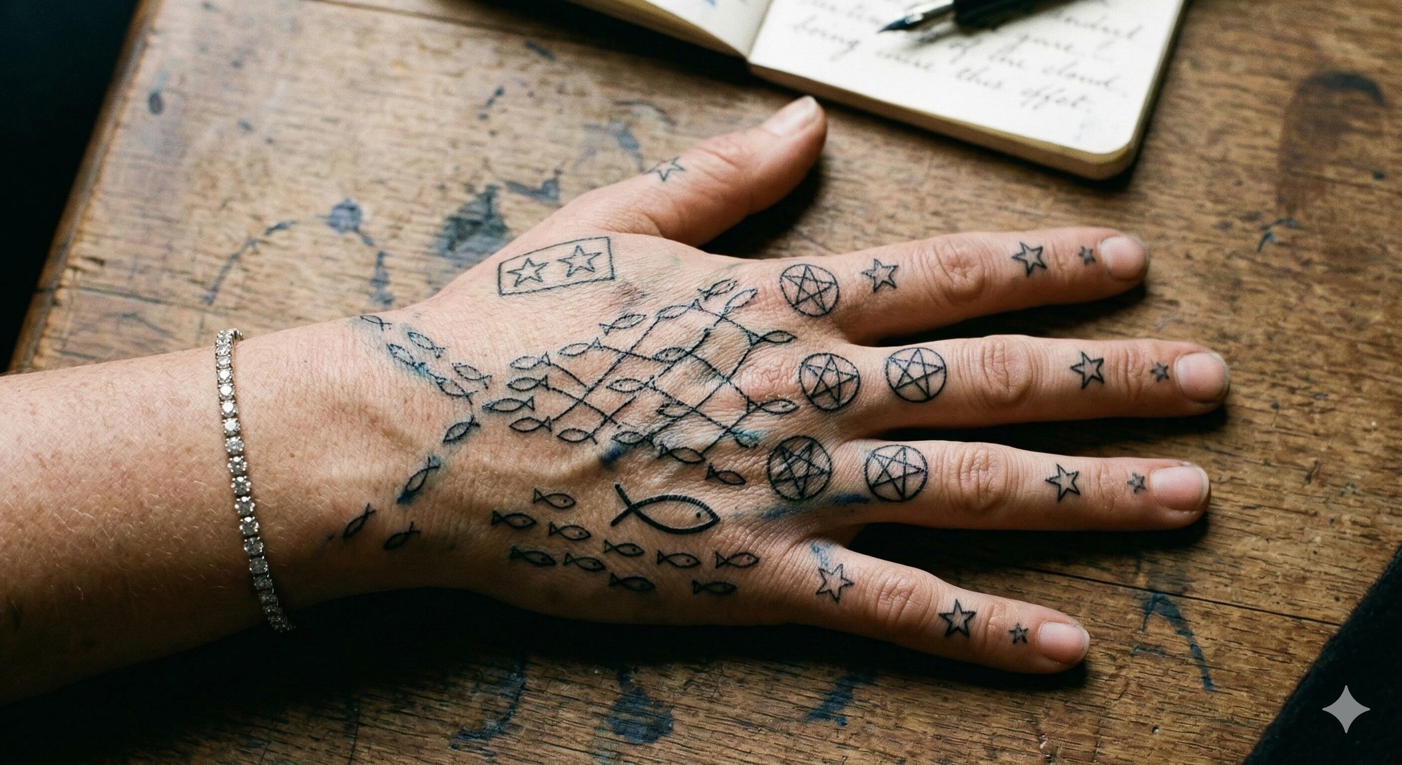 4重の枠と五芒星: 意識の変容が、皮膚という物理的な境界を超えて「紋章」として浮き上がった証拠です。